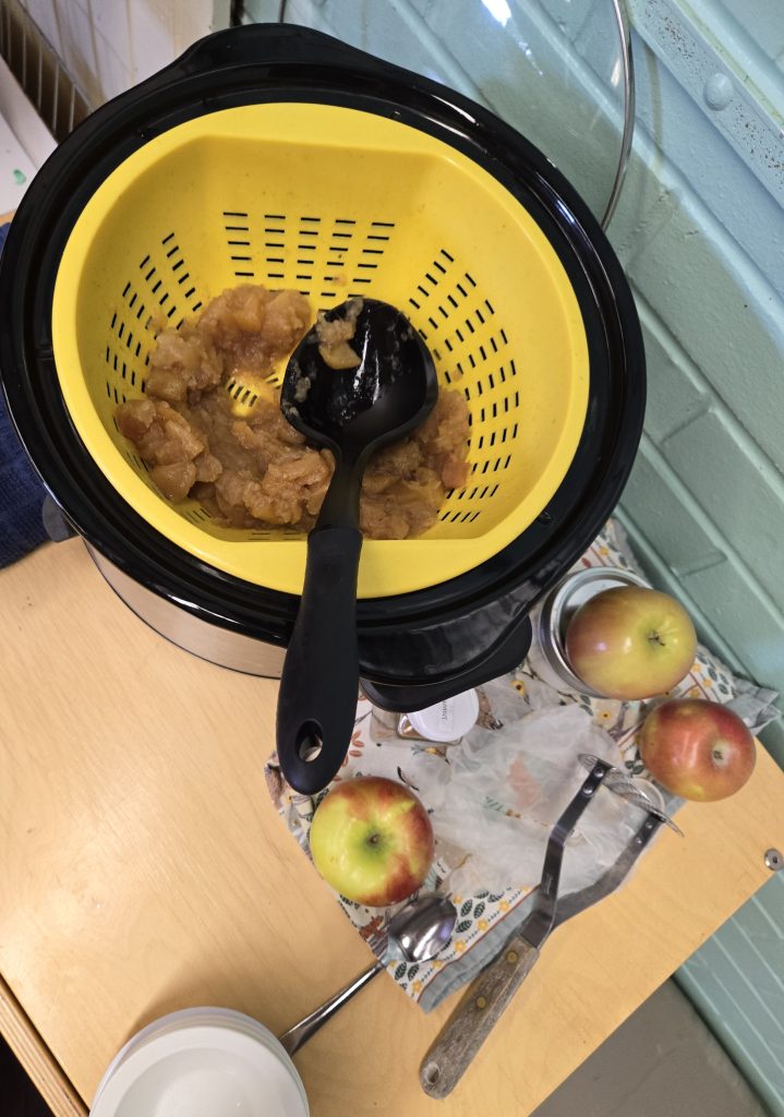 They peeled and sliced apples to make “applesauce.” As a class they discussed the ingredients in the recipe and gave everyone a chance to taste apple slices before the cooking process. They even had cinnamon spice on hand for everyone to smell as it was added to the pot!