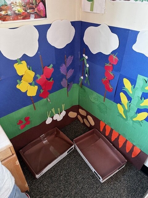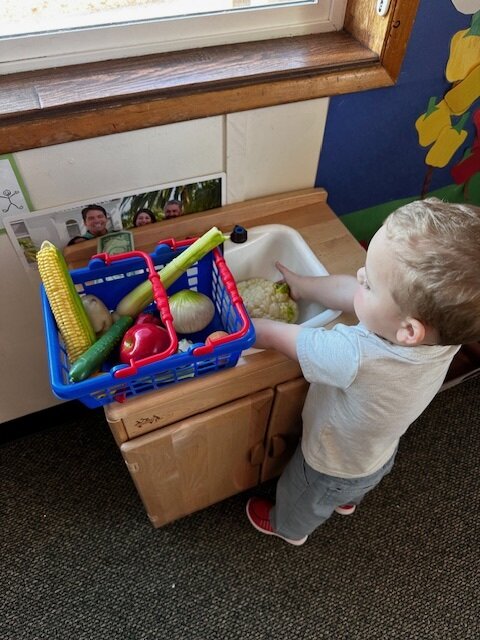 Children transformed into shopkeepers, gardeners, and cashiers in the blink of an eye. They enjoyed shopping at the market, waiting in line to purchase their items, washing the vegetables in the sink, and harvesting from the garden.