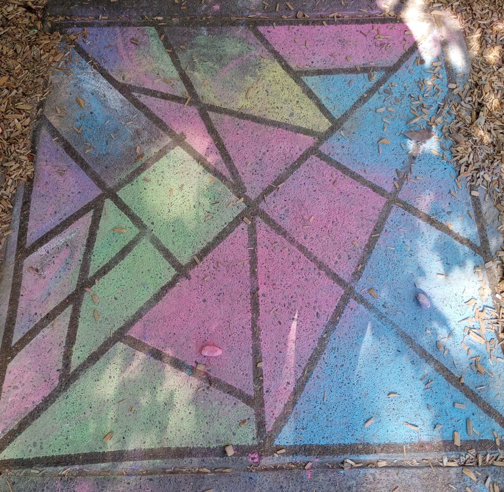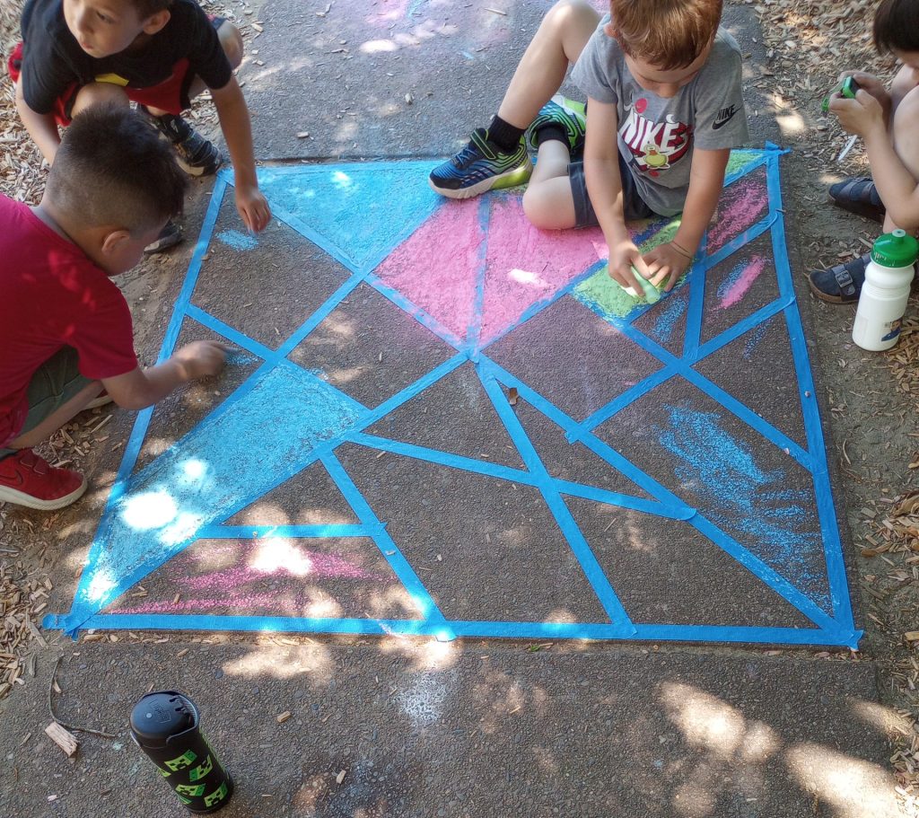 The Park 2 AM and PM made mosaic caulk art. They used painters tape to make patterns then colored them in with caulk. We took off the tape to see our master pieces.