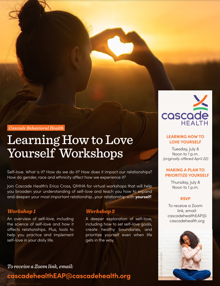 Join Cascade Health’s Erica Cross, QMHA for virtual workshops that will help you broaden your understanding of self-love and teach you how to expand and deepen your most important relationship … your relationship with yourself!